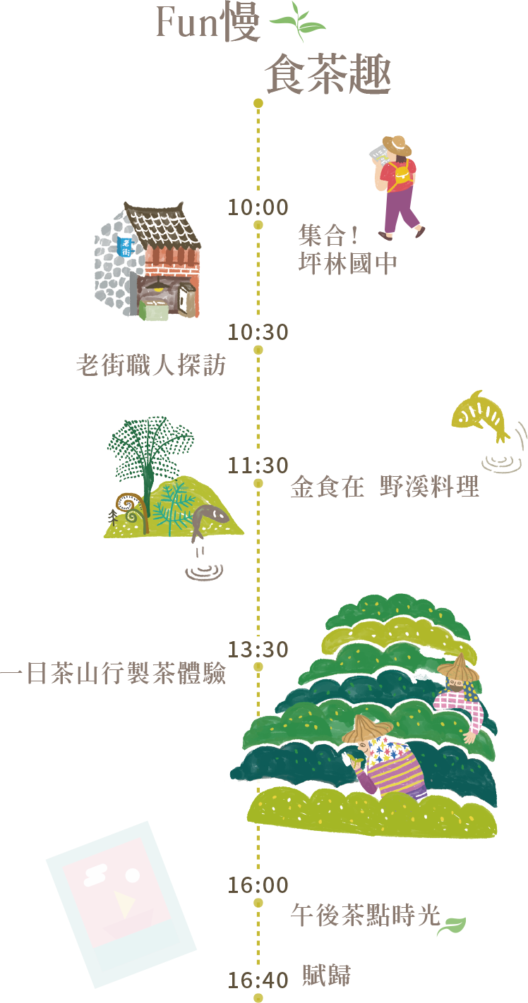 隨著24節氣的步調,來到茶山當一位美食偵探,我們將走訪老街,尋找職人們自製的手工好料。深入茶園與茶師相會,品茗,也品一份感動。享受一道道山林佳餚,體會產地到餐桌的幸福滋味。最後來到潺潺溪水邊,感受大自然的洗禮,今年夏天,洄遊坪林,來一趟不一樣的茶山慢食之旅。